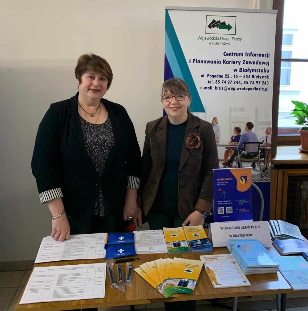 Targi Pracy Uniwersytetu w Białymstoku - 8 kwietnia 2025 - stoisko Centrum Informacji i Planowania Kariery Zawodowej w Białymstoku - dwie osoby na stoisku oraz materiały informacyjne.